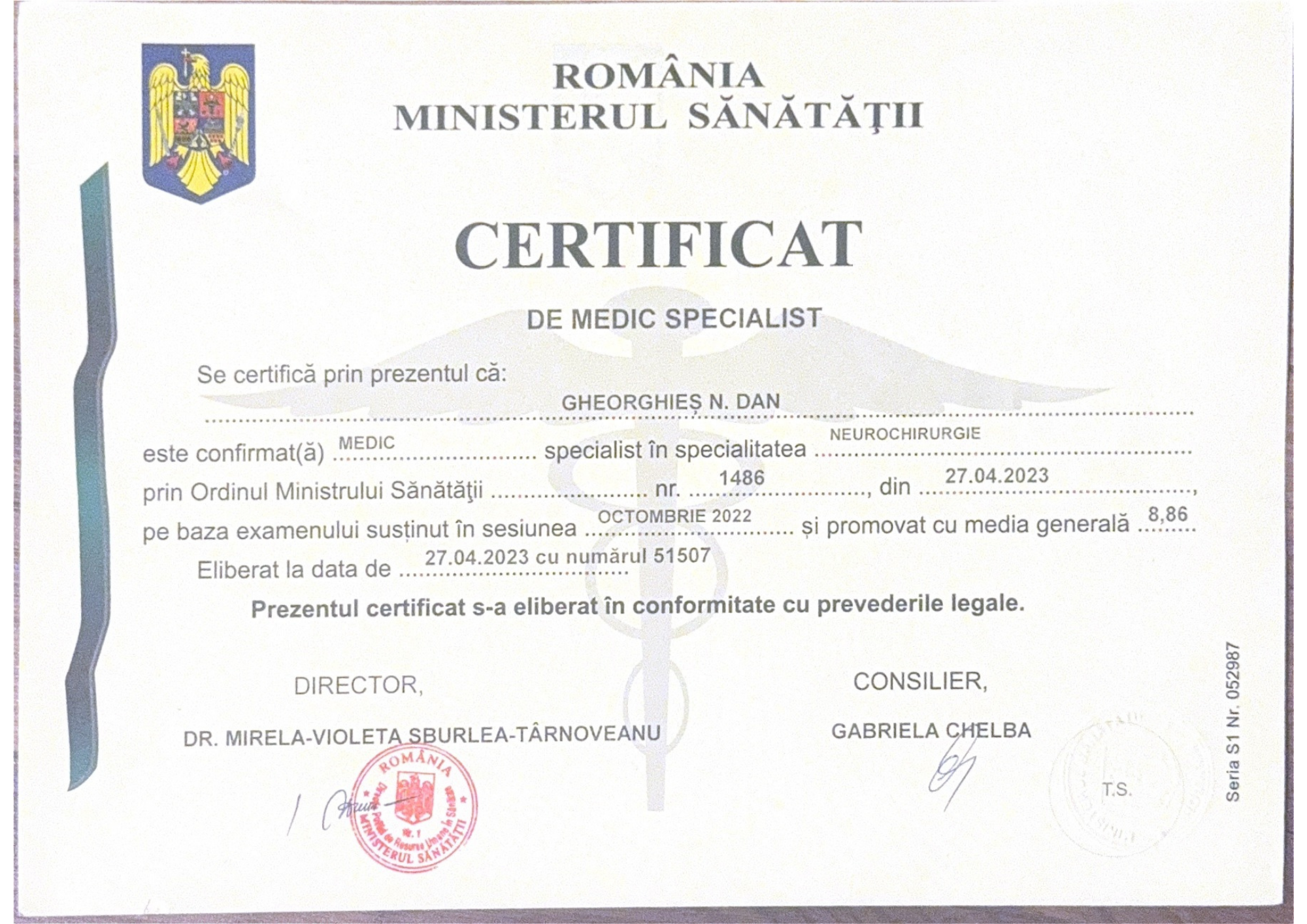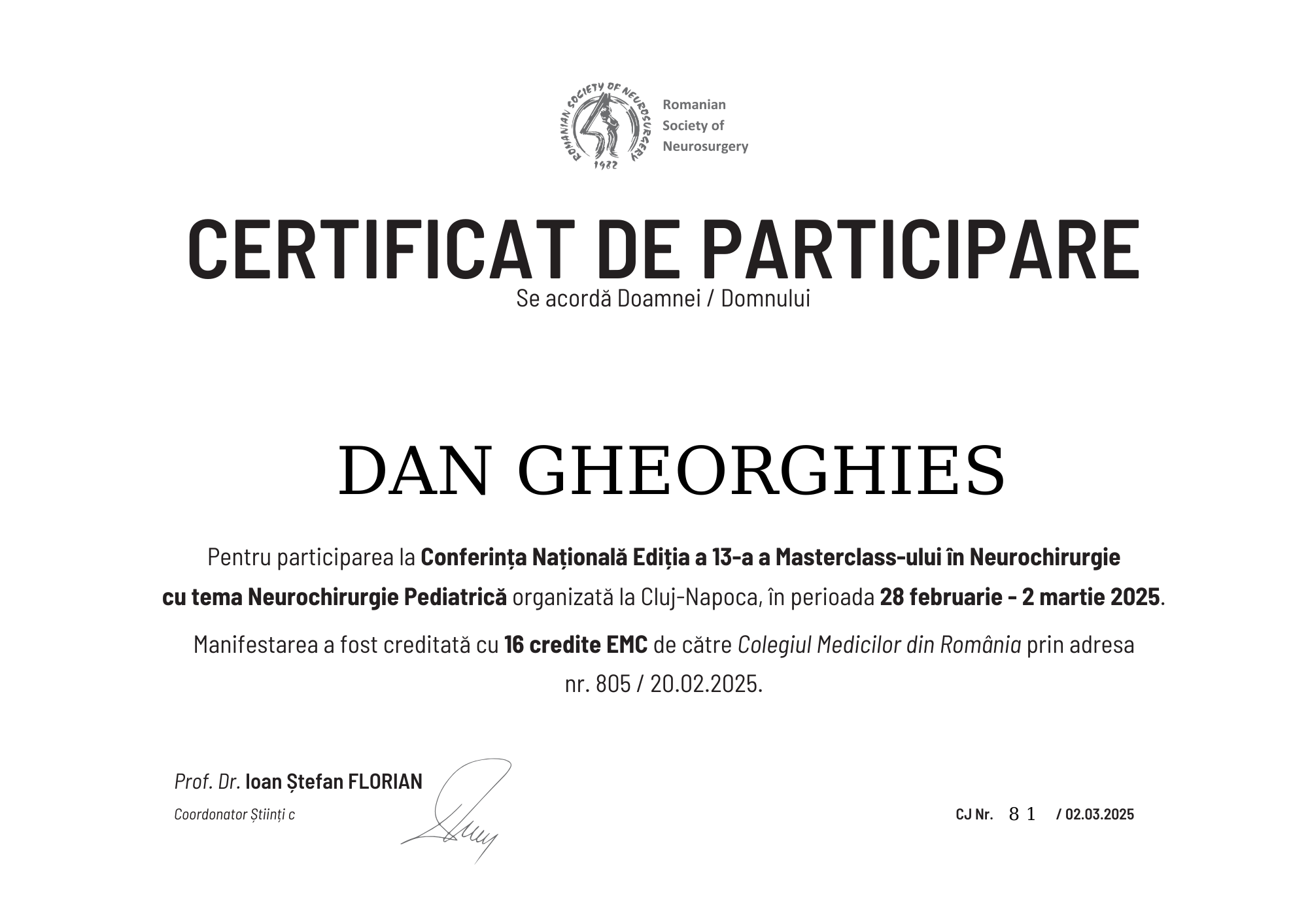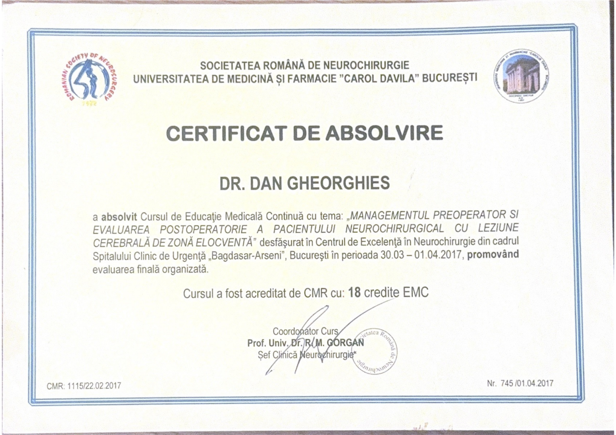 Studii de licență & rezidențiatFormare completă în neurochirurgie, cu accent pe patologia coloanei vertebrale, patologie tumorală și traumatisme cranio-cerebrale și spinale.